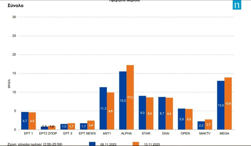 Οριακό προβάδισμα είχε το Star, έναντι του ΣΚΑΪ, ενώ η ΕΡΤ1 συγκέντρωσε τηλεθέαση 4,6%, που είναι και η δεύτερη καλύτερη για τον σταθμό από την προπερασμένη Πέμπτη (4,7%),ισοφαρίζοντας την επίδοση που είχε σημειώσει στις 23/10.