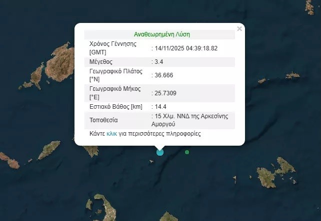 Σεισμός μεγέθους 3,4 Ρίχτερ σημειώθηκε το πρωί της Παρασκευής (14/11) ανοιχτά της Αμοργού και συγκεκριμένα νότια νοτιοδυτικά της Αρκεσίνης.