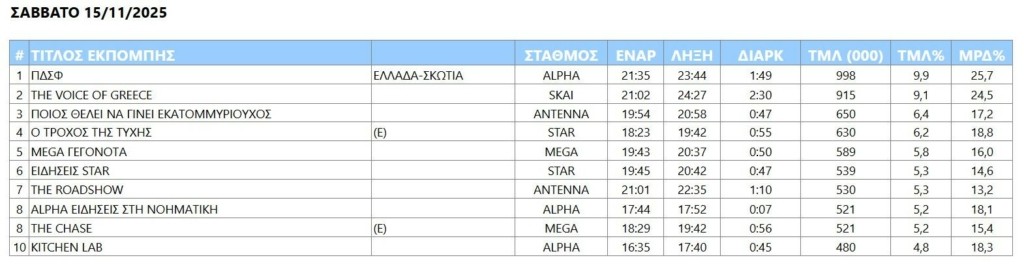Η μετάδοση του πλούσιου σε τέρματα ματς Ελλάδας – Σκωτίας ήταν εκείνη που συγκέντρωσε τα περισσότερα βλέμματα από κάθε άλλο πρόγραμμα του Σαββάτου και επηρέασε την επίδοση του «The Voice» που ήταν «απέναντί» της.