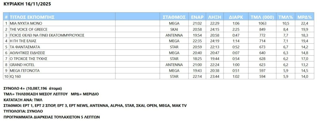 Alpha και Mega πρώτευσαν στις κούρσες τηλεθέασης του σαββατοκύριακου (15,16/11)