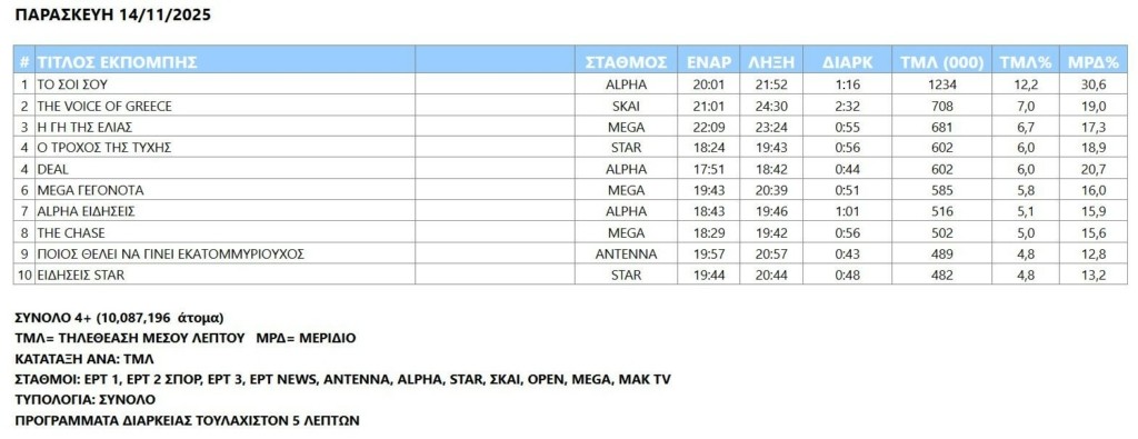 Το πρώτο σε δημοφιλία πρόγραμμα της κατηγορίας του το κεντρικό δελτίο ειδήσεων του Mega, έφθασε στην έκτη θέση του Top 10 της ημέρας με εκείνο του Alpha αμέσως μετά.