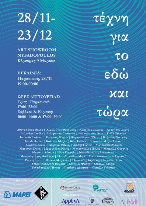 Γλύπτες, ζωγράφοι, ποιητές, φωτογράφοι και χαράκτες συμμετέχουν στην ομαδική έκθεση στο Art Showroom Nyfadopoulos από τις 28 Νοεμβρίου έως τις 23 Δεκεμβρίου 2025.