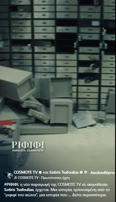 Ο Σωτήρης Τσαφούλιας προϊδεάζει για την νέα μίνι σειρά «Ριφιφί» της CosmoteTV, η οποία αναμένεται να «ανέβει» στην συνδρομητική δορυφορική πολυμεσική πλατφόρμα το αμέσως επόμενο διάστημα.