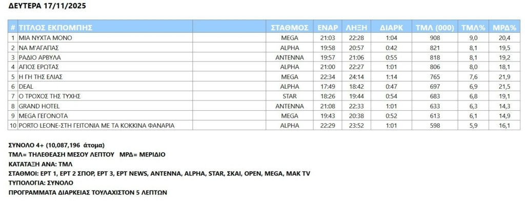 Κορυφαίο σε τηλεθέαση και τη Δευτέρα (17/11) το Mega