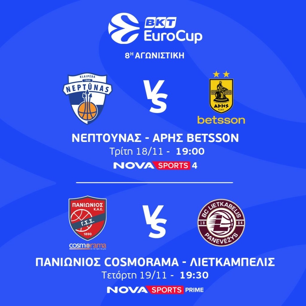 Το EuroCup συνεχίζεται με αμείωτο ενδιαφέρον και τη διπλή ελληνική εκπροσώπηση και για την 8η αγωνιστική ο Άρης αντιμετωπίζει εκτός έδρας τη Νεπτούνας (18/11, 19:00) και ο Πανιώνιος Cosmorama Travel υποδέχεται τη Λιετκαμπέλις (19/11, 19:30).