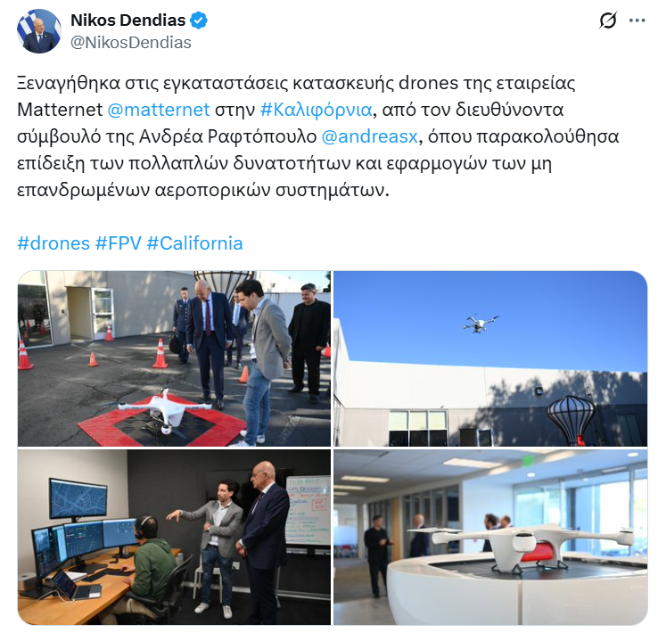 Η Matternet κατασκευάζει drones και ο Ν. Δένδιας είχε την ευκαιρία να παρακολουθήσει, όπως είπε, «επίδειξη των πολλαπλών δυνατοτήτων και εφαρμογών των μη επανδρωμένων αεροπορικών συστημάτων».