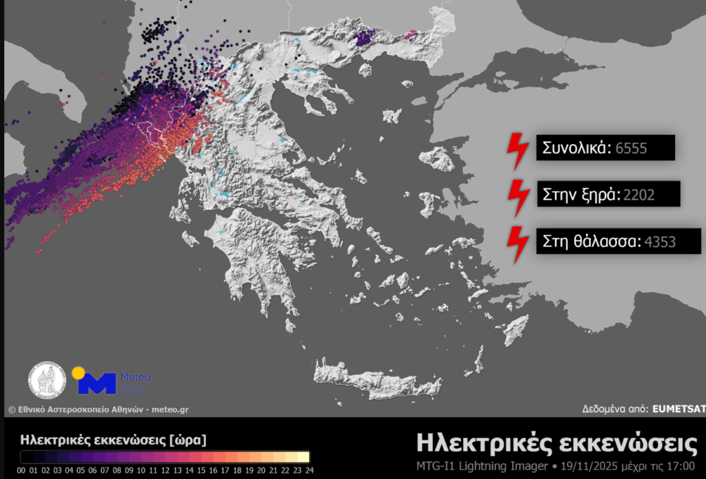 Σύμφωνα με τα δεδομένα του οργάνου Lightning Imager (LI) του μετεωρολογικού δορυφόρου Meteosat-12, από την αρχή του εικοσιτετραώρου έως τις 17:00 ώρα Ελλάδας καταγράφηκαν 2202 ηλεκτρικές εκκενώσεις πάνω από την ξηρά και 4353 πάνω από τη θάλασσα.