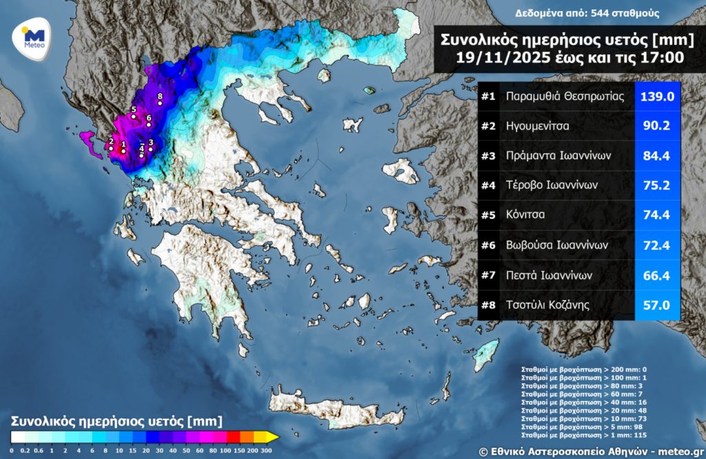 Το μεγαλύτερο ύψος βροχής έως τις 17:00 καταγράφηκε στην Παραμυθιά Θεσπρωτίας και ήταν ίσο με 139 χιλιοστά. Μεγάλος αριθμός ηλεκτρικών εκκενώσεων καταγράφηκε στην Ήπειρο και στο Βόρειο Ιόνιο.