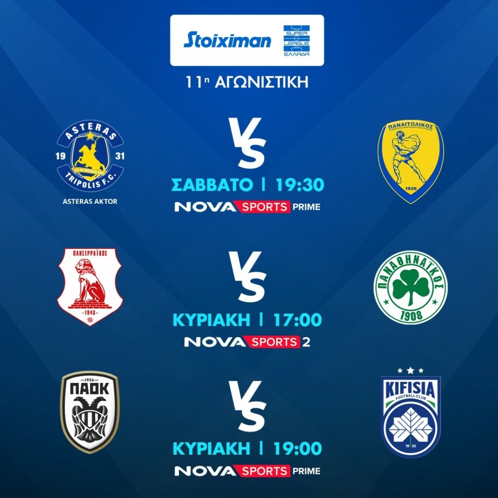 Η Stoiximan Super League, επιστρέφει στην αγωνιστική δράση με την 11η αγωνιστική και τις αναμετρήσεις Asteras Aktor – Παναιτωλικός (22/11, 19:30), Πανσερραϊκός – Παναθηναϊκός (23/11, 17:00), ΠΑΟΚ – Κηφισιά (23/11, 19:00) που θα μεταδοθούν στα κανάλια Novasports. Στα κανάλια Cosmote Sport θα μεταδοθεί το ντέρμπι ΑΕΚ – Άρης (23/11, 21:00) καθώς και τα παιχνίδια Ολυμπιακός – Ατρόμητος (22/11, 20:00), Βόλος ΝΠΣ – Λεβαδειακός (24/11, 18:00) και ΑΕΛ Novibet – ΟΦΗ (24/11, 20:00). Οι αγώνες του ελληνικού πρωταθλήματος θα πλαισιωθούν στο Novasports με την αγαπημένη εκπομπή των φιλάθλων «Η Ώρα των Πρωταθλητών» με τους Γιαννίκο Δούσκα, Λίλα Κουντουριώτη, Αποστόλη Λάμπο, καθώς και με την εκπομπή «Monday Football Club» με τους Γιάννη Πάγκο και Ντέμη Νικολαΐδη.