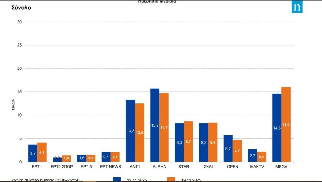 Η βαθμιαία άνοδος στην τηλεθέαση του Mega συνεχίστηκε και χθες αποσπώντας 16% μερίδιο, βελτιωμένο κατά 0,4% από αυτό της Τρίτης, ενώ οι βασικοί ανταγωνιστές του, Alpha και ANT1, εμφάνισαν υποχωρήσεις από τη μια ημέρα στην άλλη με μεγαλύτερη εκείνη του καναλιού του Αμαρουσίου, χωρίς όμως να αλλάξει κάτι στην κατάταξη τους, σύμφωνα με τη Nielsen.