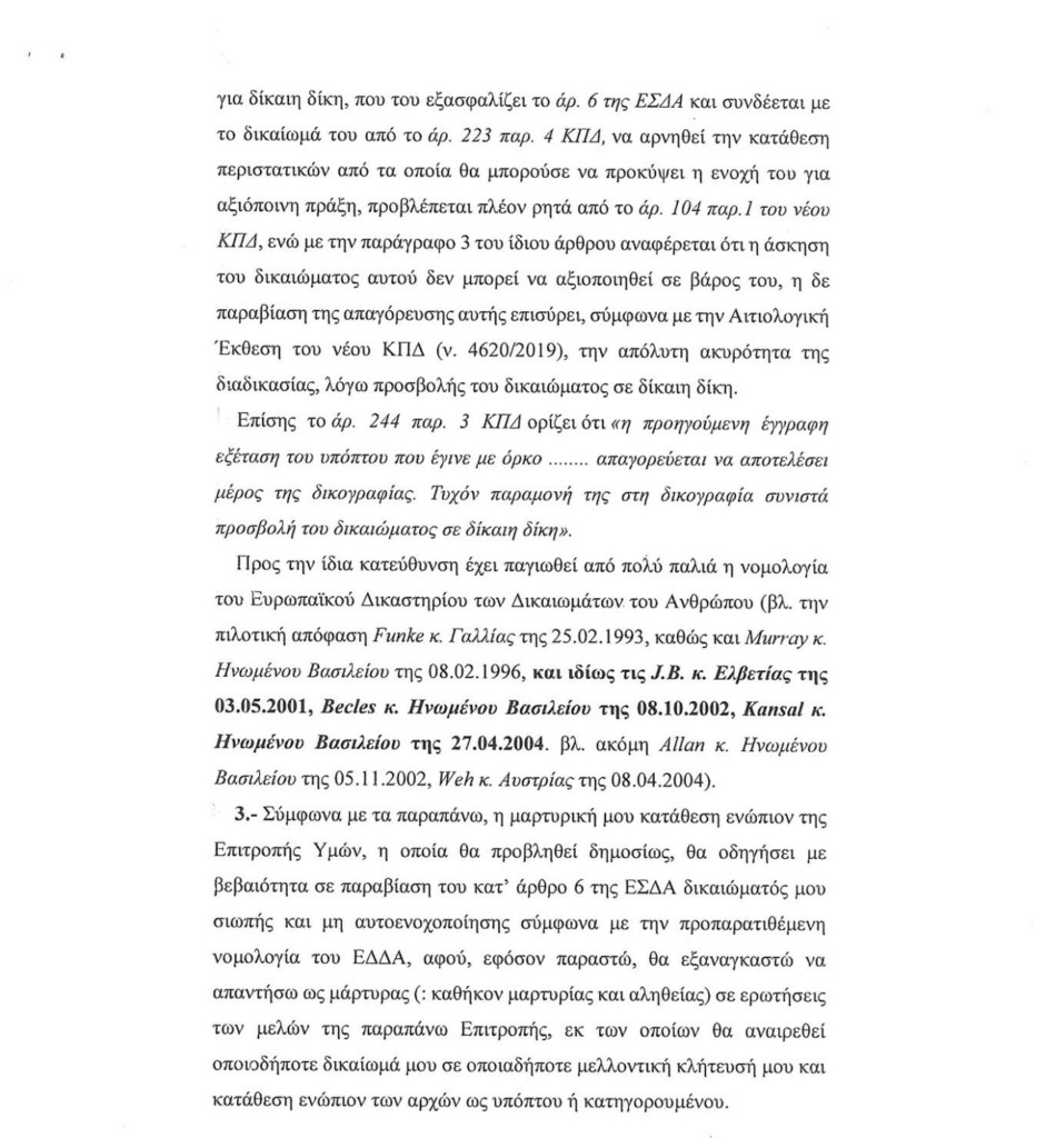 Νωρίτερα, ο Γ. Ξυλούρης με υπόμνημά του προς την Επιτροπή επικαλέστηκε το δικαίωμα της σιωπής υποστηρίζοντας ότι μετά τη διαρροή συνομιλιών που τον αφορούν αλλά και του πορίσματος της Αρχής Καταπολέμησης Νομιμοποίησης Εσόδων από Εγκληματικές Δραστηριότητες τυχόν κατάθεσή του θα αναιρέσει «οποιοδήποτε δικαιώμα μου σε οποιαδήποτε μελλοντική κλήτευση μου και κατάθεση ενώπιον των αρχών ως υπόπτου ή κατηγορούμενου».