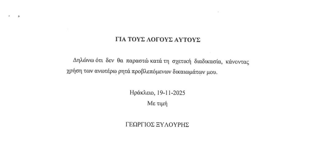 Η άρνησή του να προσέλθει δεν έχει κανένα νομικό έρεισμα. Οι Εξεταστικές Επιτροπές λειτουργούν ως ανακριτικές και εισαγγελικές αρχές, και το καθήκον μαρτυρίας είναι δεσμευτικό. Η άρνησή του υποδηλώνει τον φόβο του για πιθανή άσκηση ποινικής δίωξης. Η αλήθεια είναι απλή: ο κ. Ξυλούρης αποφεύγει τη Βουλή γιατί εκεί θα αναγκαζόταν να αποκαλύψει όσα η Νέα Δημοκρατία επιθυμεί να μείνουν στο σκοτάδι.