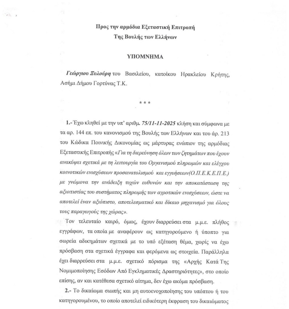 Ο κ. Ξυλούρης, που έγινε γνωστός στο πανελλήνιο με το ψευδώνυμο «Φραπές» για τις συνομιλίες και τις διασυνδέσεις του με τον Πρωθυπουργό και κυβερνητικούς αξιωματούχους, αρνείται να εμφανιστεί ενώπιον της Επιτροπής, αποστέλλοντας υπόμνημα και επικαλούμενος προσχηματικούς λόγους, την ώρα που οφείλει – όπως κάθε μάρτυρας – να καταθέσει αυτοπροσώπως και να απαντήσει στα κρίσιμα ερωτήματα που αφορούν την εμπλοκή του στο σκάνδαλο ΟΠΕΚΕΠΕ και τις προνομιακές σχέσεις του με κυβερνητικούς αξιωματούχους.