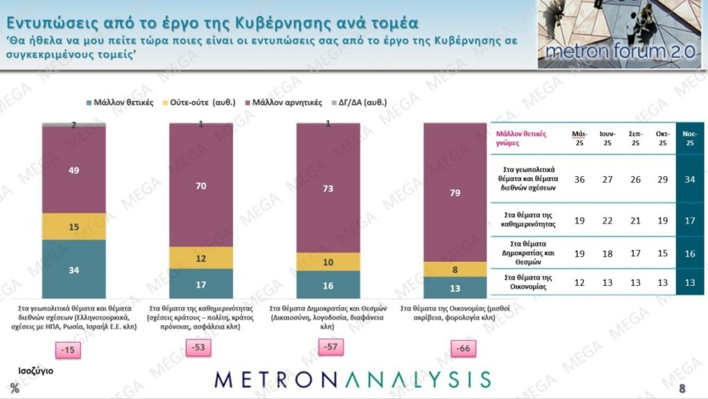Όσον αφορά την αξιολόγηση του κυβερνητικού έργου ανά τομείς, οι χειρισμοί στα θέματα της Οικονομίας είναι αυτοί που συγκεντρώνουν τα περισσότερα πυρά (79% αρνητικές γνώμες), ακολουθούμενοι από εκείνους που αφορούν θέματα Δημοκρατίας και Θεσμών (73% αρνητικές γνώμες), εκείνους για τα ζητήματα της καθημερινότητας (70% αρνητικές γνώμες) και τέλος τα γεωπολιτικά (49% αρνητικές γνώμες).