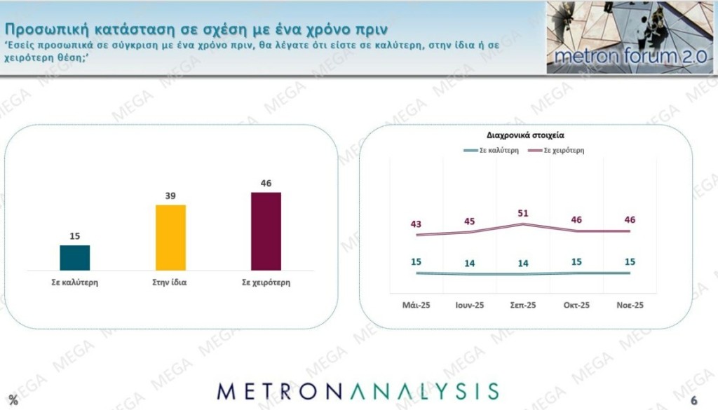 Οι περισσότεροι συγκριτικά πολίτες δηλώνουν στη δημοσκόπηση ότι η δική τους κατάσταση έχει επιδεινωθεί σε σχέση με έναν χρόνο πριν, αρκετοί υποστηρίζουν ότι είναι ίδια, και βελτίωση δηλώνει μόνο το 15%.