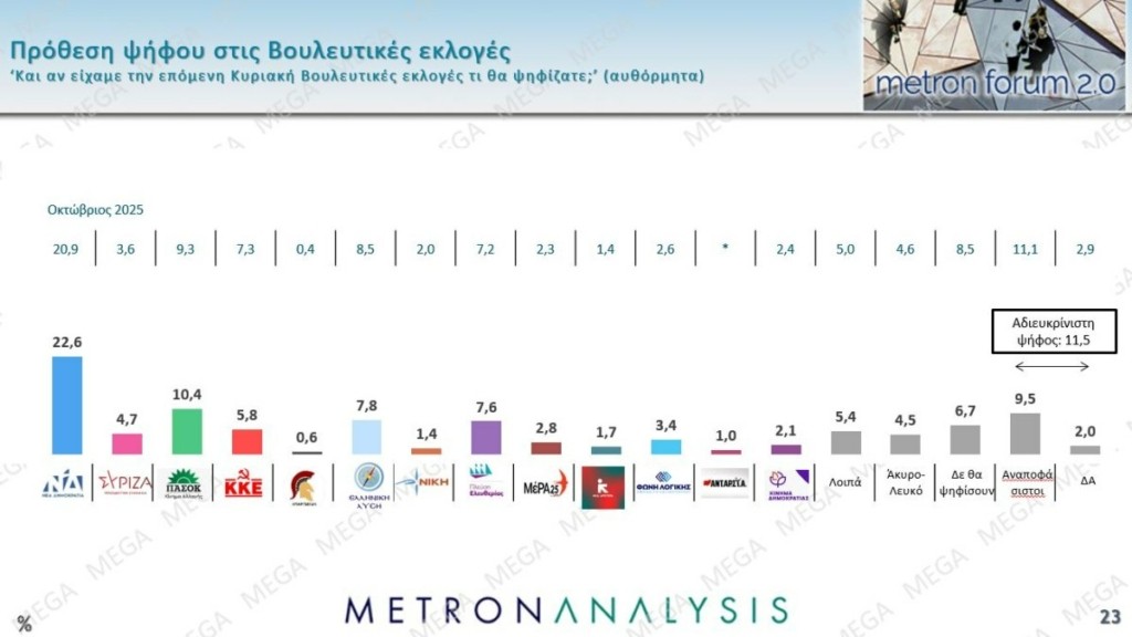 Πιο συγκεκριμένα, στην πρόθεση ψήφου, η Νέα Δημοκρατία προηγείται με 22,6% και ακολουθεί το ΠαΣοΚ με 10,4%, η Ελληνική Λύση με 7,8%, η Πλεύση Ελευθερίας με 7,6% και το ΚΚΕ με 5,8%, ενώ ο ΣΥΡΙΖΑ βρίσκεται στο 4,7%.