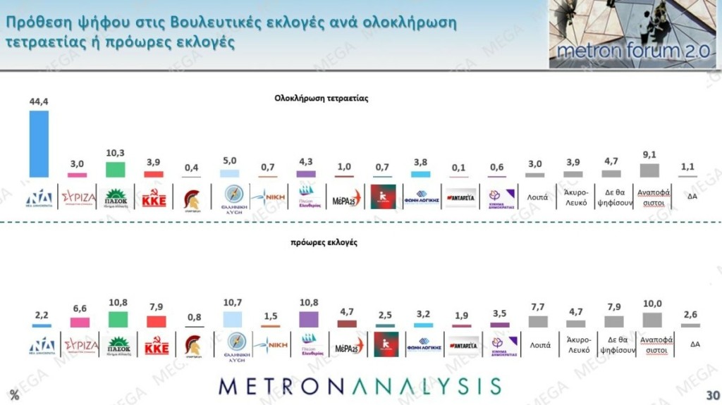 Στην εκτίμηση ψήφου η ΝΔ συγκεντρώνει ποσοστό 29,3%, το ΠΑΣΟΚ 13,5%, η Ελληνική Λύση 10%, η Πλεύση Ελευθερίας 9,8%, το ΚΚΕ 7,5% και ο ΣΥΡΙΖΑ 6,1%.