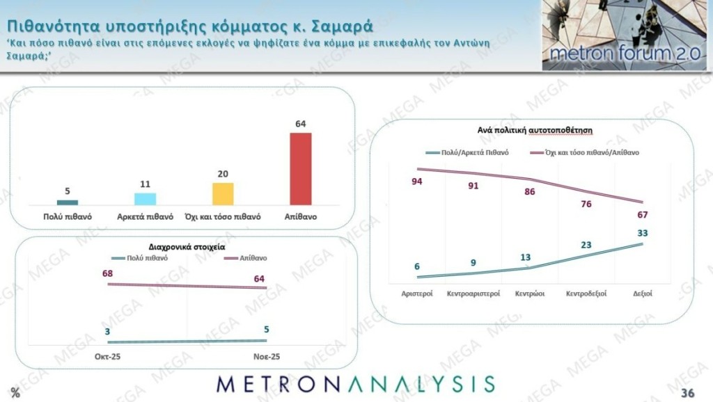 Ως προς την πιθανότητα να υπάρξει ένα κόμμα υπό την ηγεσία του Αντώνη Σαμαρά, το 5% δηλώνει ότι είναι πολύ πιθανό να το ψηφίσει και ένα 11% ότι είναι αρκετά πιθανό, ενώ το 64% ότι είναι απίθανο.