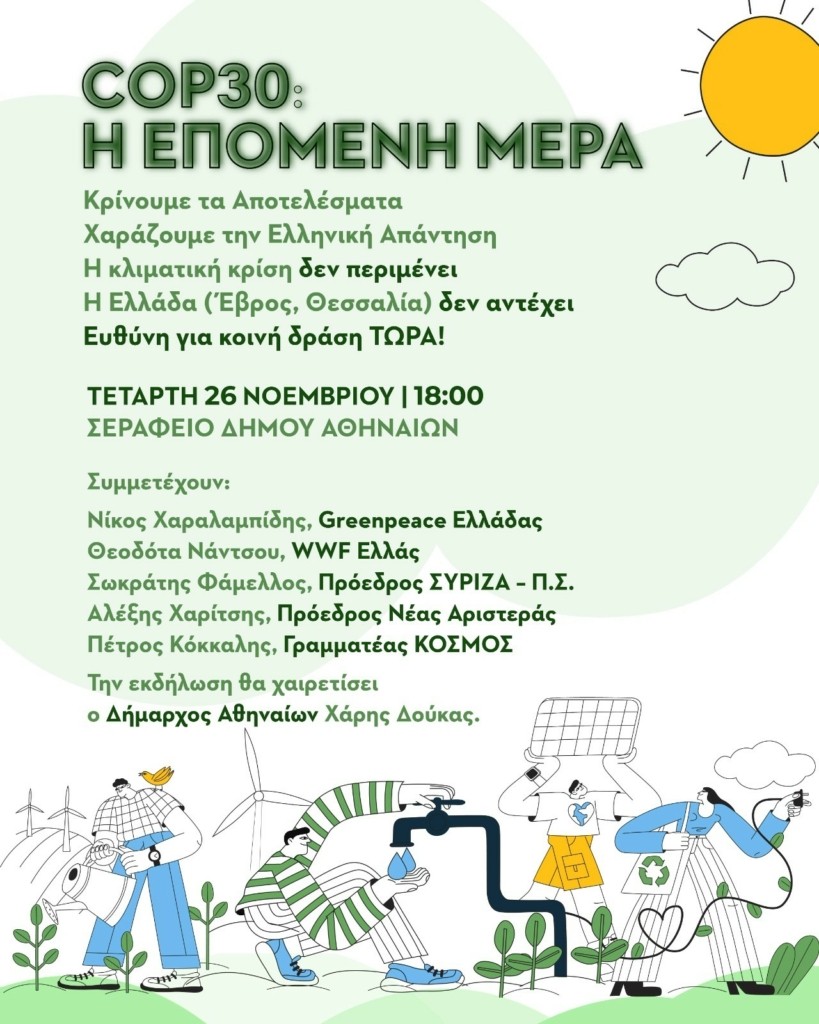 Όπως αναφέρεται στο κάλεσμα για την εκδήλωση «η COP30 στη Βραζιλία δεν είναι απλώς μια διπλωματική διάσκεψη» αλλά «το πεδίο όπου κρίνεται η οικονομική επιβίωση και η δημόσια υγεία της χώρας μας. Με την κλιματική αλλαγή να κοστίζει ήδη στην Ελλάδα 2,2 δισ. ευρώ ετησίως και τους καύσωνες να απειλούν ευθέως τη ζωή και την υγεία των πολιτών στα αστικά κέντρα, η αδράνεια δεν είναι απλώς πολιτική επιλογή, είναι κοινωνική και οικονομική αιμορραγία.