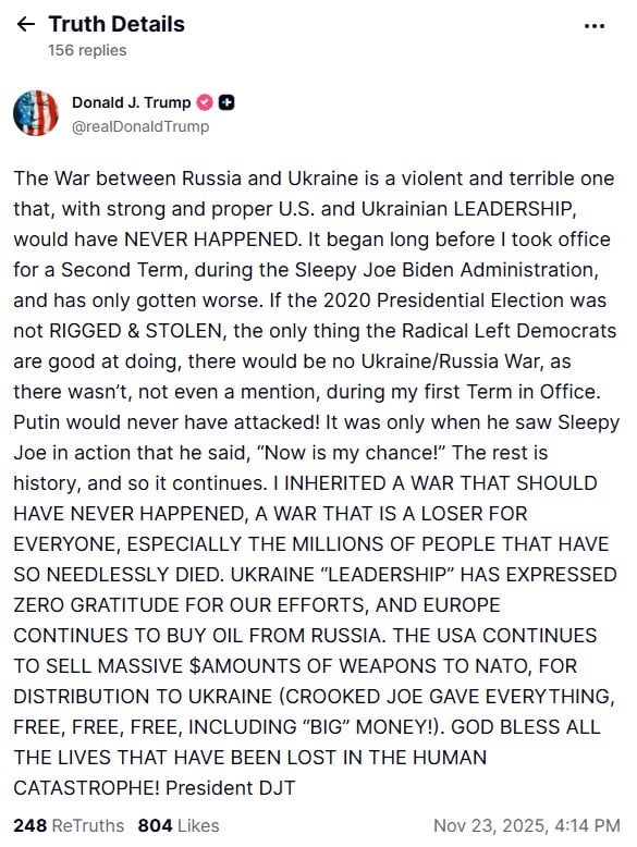 Η ανάρτηση Τραμπ έρχεται λίγη ώρα μετά τα τρία όχι της φον ντερ Λάιεν στο αμερικανικό σχέδιο των 28 σημείων που βάζει τον Ζελένσκι στις συμπληγάδες.