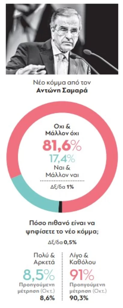 Όσον αφορά στα – πιθανά – νέα κόμματα, η δημοσκόπηση δείχνει ότι ως ωφέλιμη για τη χώρα και τους πολίτες κρίνεται από το 26,5% η ίδρυση ενός κόμματος από τον Αλέξη Τσίπρα και 17,4% από τον Αντώνη Σαμαρά, ενώ 26,1 % θεωρεί ωφέλιμη την ίδρυση κόμματος από την Μαριά Καρυστιανού. Πάντως, σημειώνεται ότι με την εκλογική επιρροή δεν πρέπει να ταυτίζεται η δυνητική ψήφος, που, επί της ουσίας, αποκαλύπτει τις δεξαμενές και τα όρια των υπό ίδρυση κομμάτων, με τον κ. Τσίπρα να καταγράφεται ως πολύ πιθανή επιλογή από το 8,3% και ως αρκετά πιθανή από το 10,5%, με τα αντίστοιχα ποσοστά για τον κ. Σαμαρά να διαμορφώνονται στο 2,2% συν 6,3%, ενώ η κ. Καρυστιανού καταγράφεται ως ισχυρή πιθανότητα για το 9,5% με τη δυνητική ψήφο να επεκτείνεται στο 10%, αθροίζοντας ένα συνολικό ποσοστό της τάξης του 19,5%.