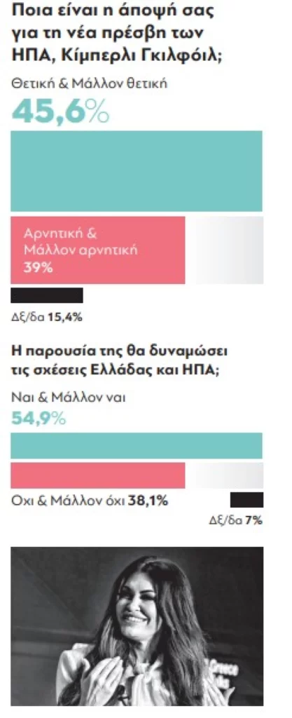 Τέλος, το 45,6% εκφράζει θετική άποψη για τη νέα πρέσβειρα των ΗΠΑ στην Ελλάδα, Κίμπερλι Γκιλφόιλ, και το 54,95 θεωρεί ότι η παρουσία της θα ενδυναμώσει τις σχέσεις των δύο χωρώμ+ν.