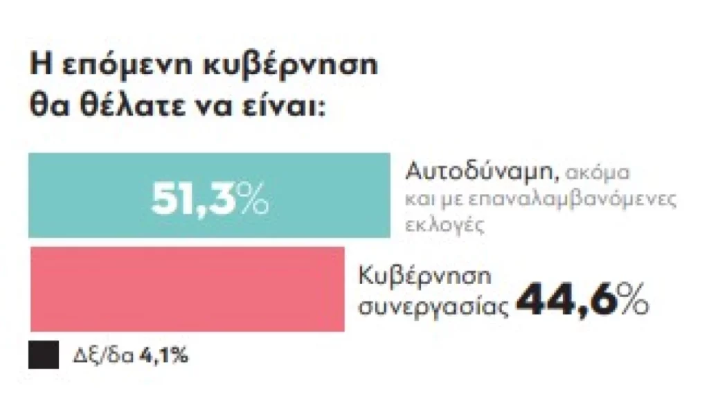 Το 26,7% που επιθυμεί μετά τις επόμενες εκλογές η Ν.Δ. να συνεχίσει να είναι κυβέρνηση και ο Κ. Μητσοτάκης πρωθυπουργός είναι ένας πολύ σημαντικός δείκτης, καθώς εκτιμάται ότι αποτυπώνει σε πολύ σημαντικό βαθμό τους πολιτικούς συσχετισμούς.