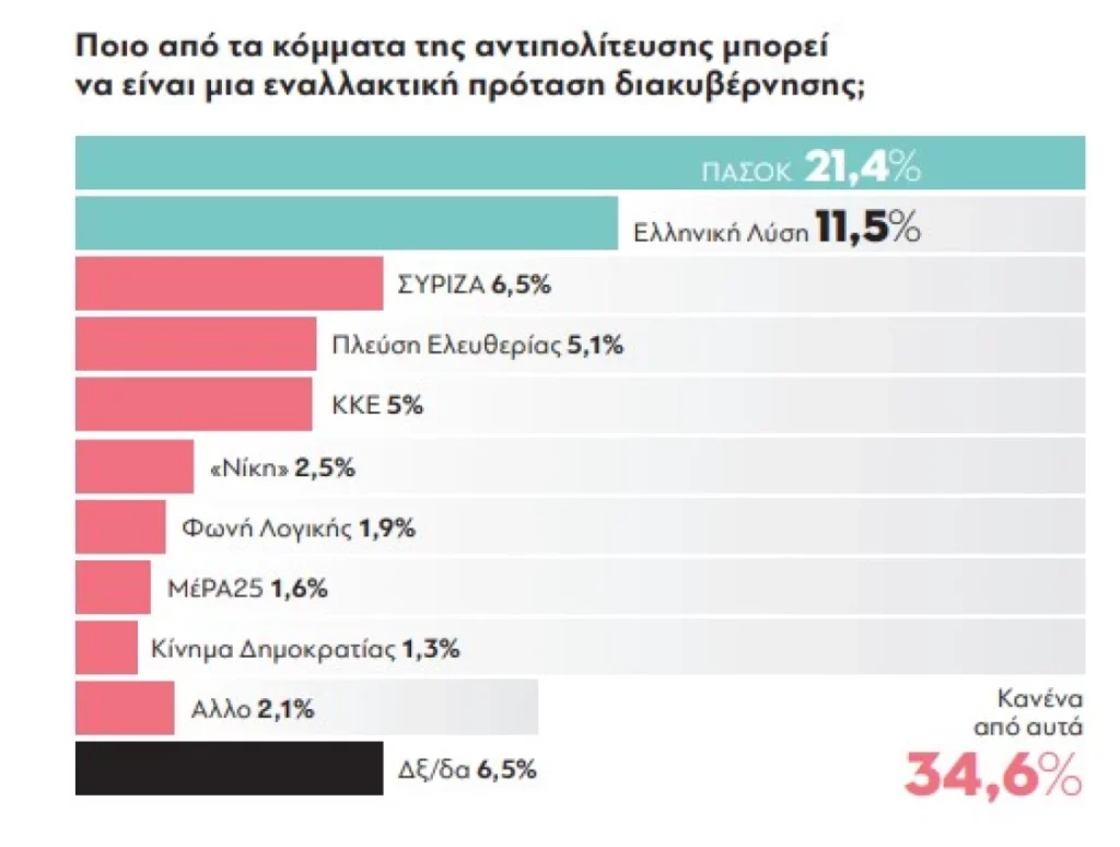 Η μεγάλη πλειοψηφία, βέβαια, σε ποσοστό 71,2%, επιθυμεί κυβερνητική και πολιτική αλλαγή, χωρίς, ωστόσο, ακόμη να έχει βρεθεί ο φορέας που θα μπορέσει να εκφράσει μαζικά αυτό το αίτημα αλλαγής. Προς το παρόν, ως η πιο πειστική κυβερνητική εναλλακτική καταγράφεται το ΠΑΣΟΚ με 21,4%, με την πλειοψηφία, ωστόσο, να μη φαίνεται να πείθεται από κανέναν, σε ποσοστό 34,6%. Σημειώνεται δε ότι για τους πολίτες η αυτοδυναμία θεωρείται ως απαραίτητη προϋπόθεση για τη διακυβέρνηση της χώρας.