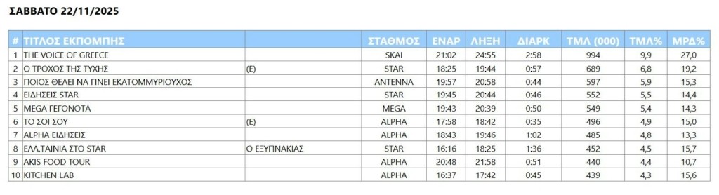 Πρώτος σε τηλεθέαση ο ΣΚΑΪ το Σάββατο (22/11), τον διαδέχθηκε το Mega την Κυριακή (23/11)