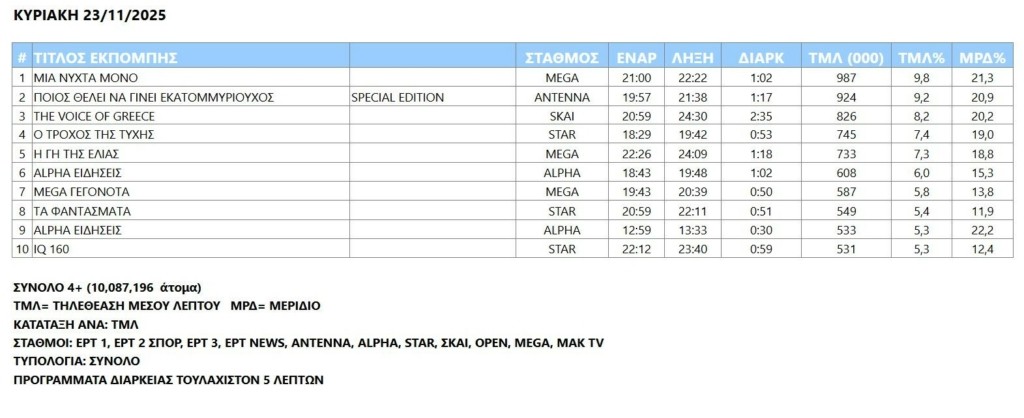 Πρώτο σε προτιμήσεις πρόγραμμα ήταν η σειρά «Μια νύχτα μόνο», δεύτερο το «Ποιος θέλει να γίνει εκατομμυριούχος- Special edition» και τρίτο το «The Voice».