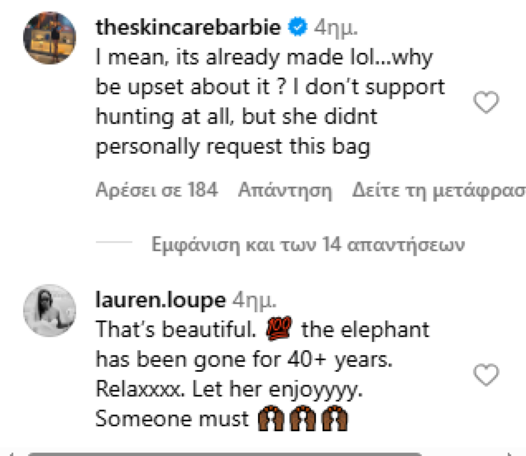 «Λατρεύω τις Birkin, αλλά το δέρμα ελέφαντα είναι άλλο επίπεδο. Είναι σχεδόν ιερά ζώα, δεν γίνεται αυτό» σχολίασε κάποιος άλλος, με πολλούς να χαρακτηρίζουν την εικόνα «οριακή» και «σοκαριστική»