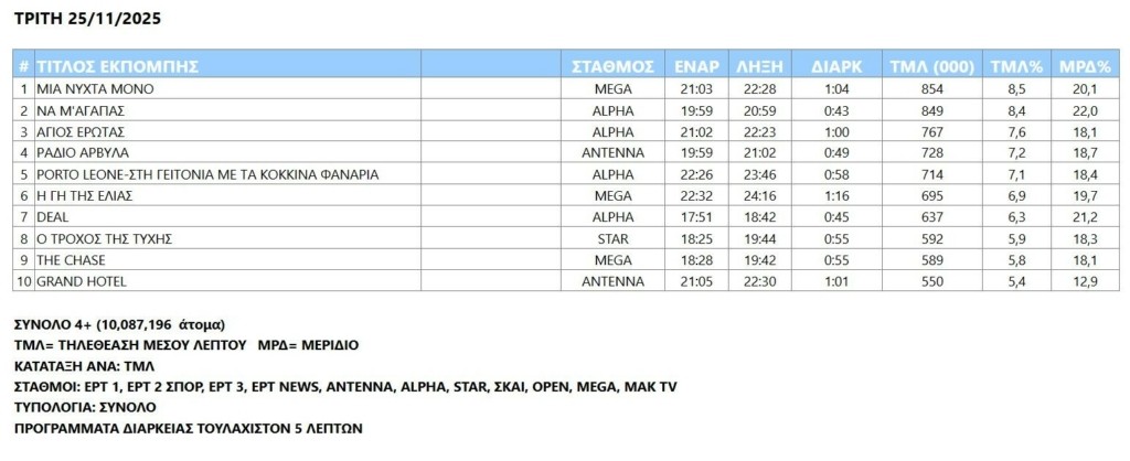 Όπως ακριβώς είχαν διακριθεί οι σειρές «Μια νύχτα μόνο», «Να μ’ αγαπάς», «Άγιος έρωτας» και «Ράδιο αρβύλα» στην εκκίνηση της εβδομάδας στη βραχεία λίστα της Nielsen με τα δημοφιλέστερα προγράμματα, με την ίδια σειρά εμφανίστηκαν και στο χθεσινό Top 10.