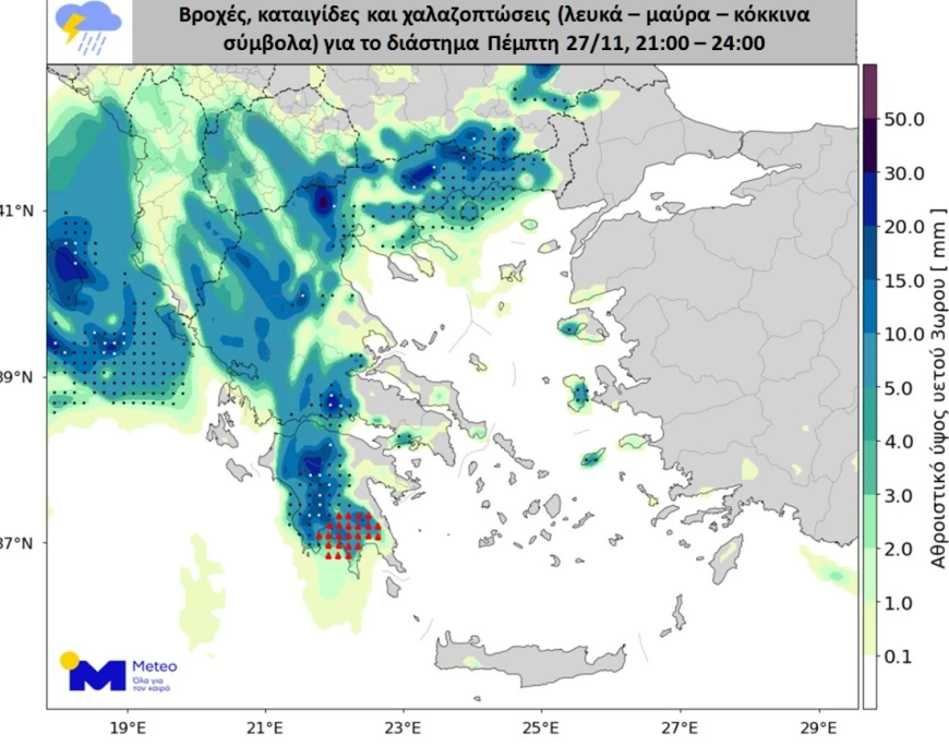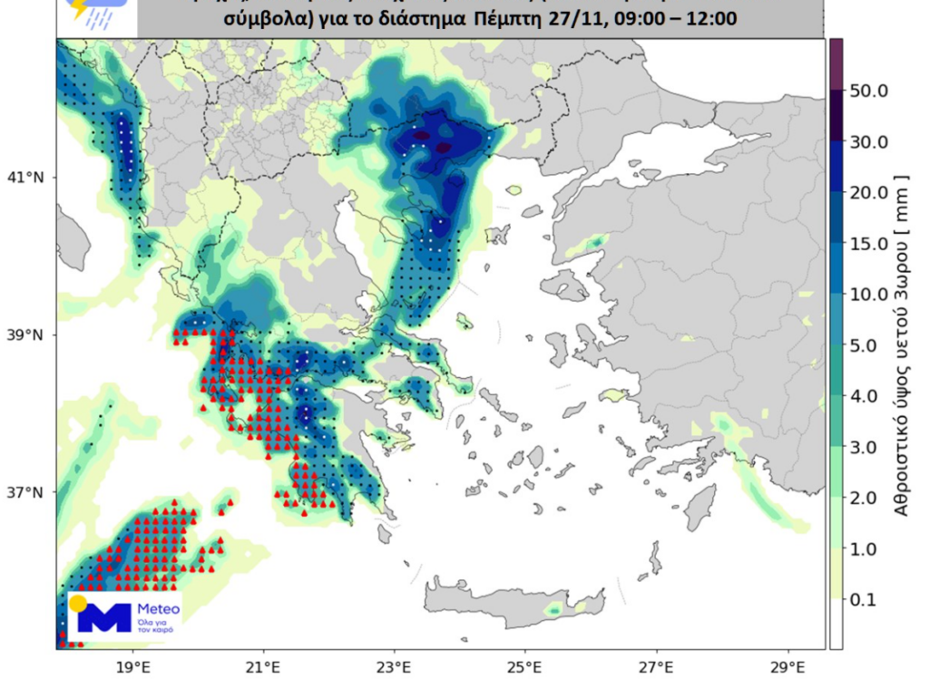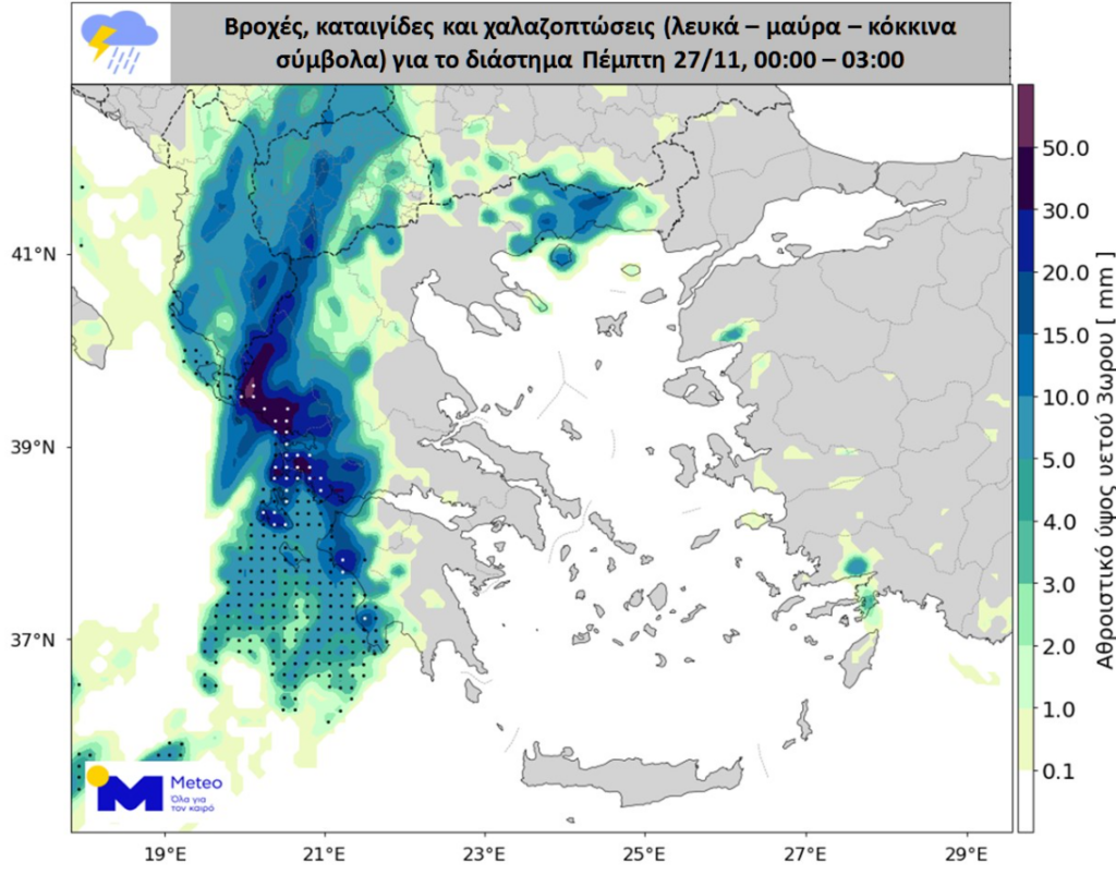 Την Πέμπτη 27/11 έντονες και τοπικά πολύ έντονες βροχοπτώσεις και καταιγίδες θα εκδηλώνονται κατά περιόδους στα Επτάνησα, στα δυτικά ηπειρωτικά, στην Πελοπόννησο, στην Ανατολική Μακεδονία και στη Θράκη, συνοδευόμενα κατά τόπους από χαλαζοπτώσεις. Επισημαίνεται ότι στα Επτάνησα, στα δυτικά ηπειρωτικά και δευτερευόντως στην Πελοπόννησο το χαλάζι ενδέχεται να έχει σχετικά μεγάλο μέγεθος. Στην υπόλοιπη χώρα θα εκδηλωθούν επίσης βροχές και σποραδικές καταιγίδες, με παροδικά έντονα φαινόμενα. Στις περιοχές που θα επηρεαστούν συμπεριλαμβάνονται οι πόλεις της Αθήνας και της Θεσσαλονίκης.