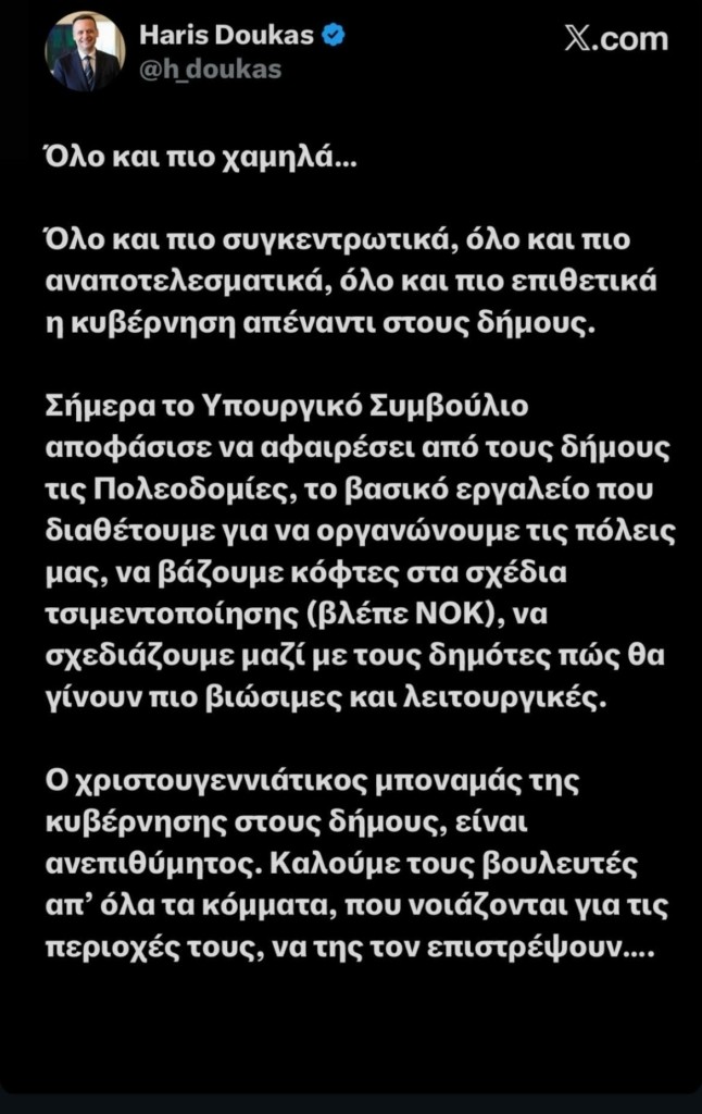 Σήμερα το Υπουργικό Συμβούλιο αποφάσισε να αφαιρέσει από τους δήμους τις Πολεοδομίες, το βασικό εργαλείο που διαθέτουμε για να οργανώνουμε τις πόλεις μας, να βάζουμε κόφτες στα σχέδια τσιμεντοποίησης (βλέπε ΝΟΚ), να σχεδιάζουμε μαζί με τους δημότες πώς θα γίνουν πιο βιώσιμες και λειτουργικές.