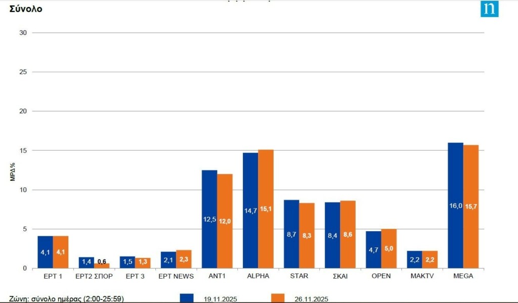 Βελτίωσε κάπως την επίδοση του ο ΑΝΤ1 και ο ΣΚΑΪ πήρε μικρό προβάδισμα απέναντι στο Star. Το Open… ξαναείδε το 5 στο κύριο μέρος του μεριδίου του.