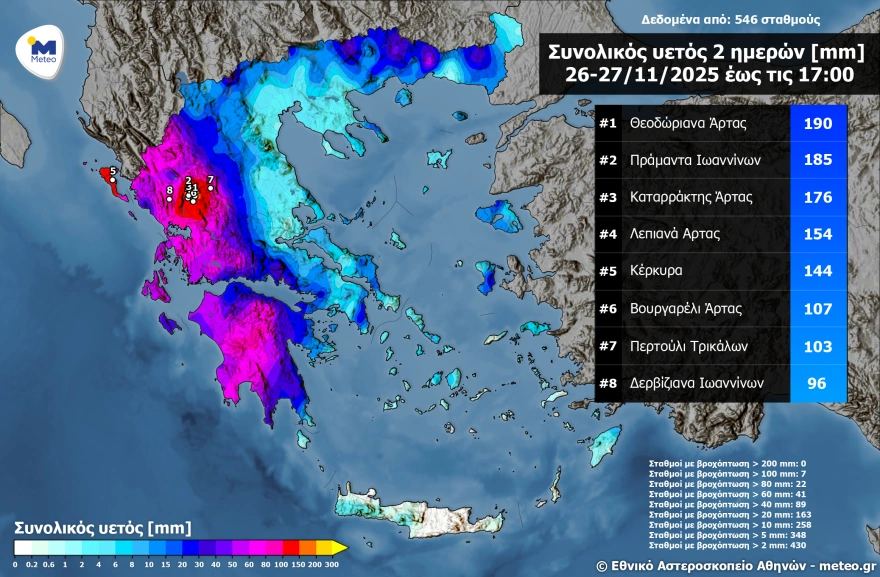 Ενδεικτικά της σφοδρότητας των φαινομένων είναι τα στοιχεία που δημοσίευσε το Meteo για τις βροχοπτώσεις. Επίμονες και ισχυρές κατά τόπους βροχοπτώσεις επηρέασαν εκ νέου τη Δυτική Ελλάδα την Τετάρτη 26 Νοεμβρίου και έως τις πρώτες απογευματινές ώρες της Πέμπτης (27/11), ενώ αυτή τη φορά επηρεάστηκε σημαντικά και η Πελοπόννησος. Ως αποτέλεσμα καταγράφονται πολύ μεγάλα αθροιστικά ύψη υετού.