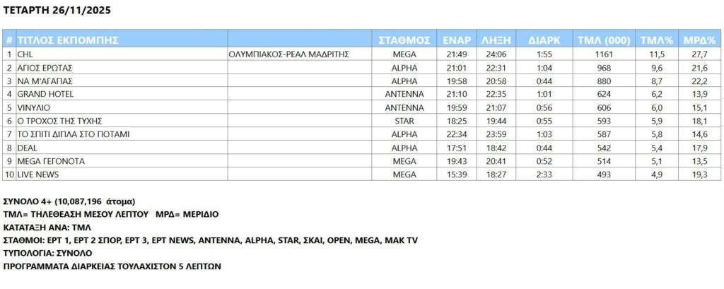 Επτά γκολ έστειλαν, κατά βάση, το Mega στην κορυφή της τηλεθέασης την Τετάρτη (26/11)