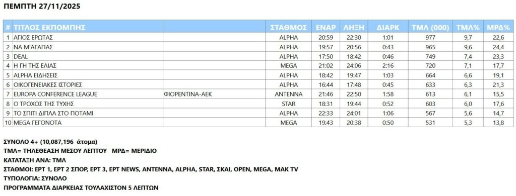 Αξιοσημείωτο είναι πως το σίριαλ που προηγείται, «Να μ’ αγαπάς», είχε σχεδόν ίδια τηλεθέαση και, αν δείτε πιο κάτω στο Top 10, το δελτίο του σταθμού, αλλά και το πλήθος των τηλεθεατών που το επέλεξαν για την ενημέρωσή τους, γίνεται αντιληπτή η γραμμική αύξηση τηλεθέασης στον Alpha με ισχυρή τάση σταθερότητας στο σημαντικότερο κομμάτι του prime time.