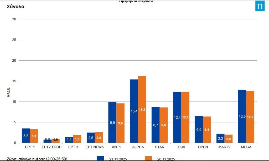 Δεύτερο σε προτιμήσεις πρόγραμμα στο σύνολο της ημέρας «ψηφίστηκε» εκείνο του Mega. To Open παρακολούθησε τον δείκτη της Nielsen να σταματά στο 6,4%, ενώ η ΕΡΤ1 υποχώρησε στο 3,3%.