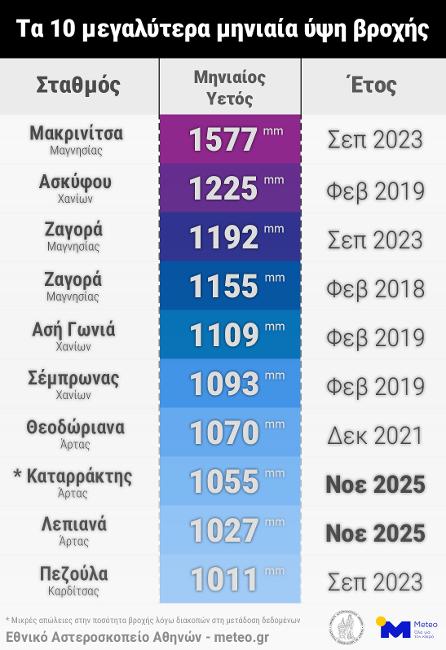 Ειδικότερα, σύμφωνα με το METEO , οι μηνιαίες τιμές βροχόπτωσης του Νοεμβρίου 2025 στον Καταρράκτη και στα Λεπιανά ‘Αρτας συγκαταλέγονται στα δέκα μεγαλύτερα μηνιαία ύψη βροχής που έχουν καταγραφεί από την έναρξη λειτουργίας του δικτύου αυτόματων μετεωρολογικών σταθμών του meteo.gr / Εθνικού Αστεροσκοπείου Αθηνών. «Τα δέκα μεγαλύτερα μηνιαία ύψη βροχής εμφανίζονται κυρίως σε τρεις περιόδους με έντονα καιρικά φαινόμενα: τον Φεβρουάριο 2019 (κακοκαιρίες Χιόνη και Ωκεανίς), τον Σεπτέμβριο 2023 (κακοκαιρίες Daniel και Ηλίας) και τον Νοέμβριο 2025 (κακοκαιρία Adel)», σημειώνει το meteo.gr/ ΕΑΑ.