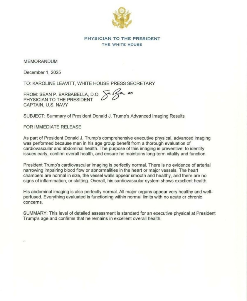 Σύμφωνα με τη γνωμάτευση του γιατρού του, που δόθηκε σήμερα στη δημοσιότητα, το καρδιαγγειακό σύστημα του Τραμπ είναι «σε άριστη κατάσταση». Οι απεικονίσεις της κοιλιακής χώρας ήταν επίσης «απολύτως φυσιολογικές» καθώς «όλα τα σημαντικά όργανα δείχνουν υγιή», αναφέρει ο γιατρός Σον Μπαρμπαμπέλα. Δεν υπήρχε κάποια ένδειξη αρτηριακής στένωσης, ούτε φλεγμονής ή θρόμβων.