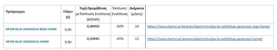 Θυμίζουμε τις πολύ ανταγωνιστικές τιμές των σταθερών οικιακών προγραμμάτων HΡΩΝ ΒLUE GENEROUS, με το 18μηνο συμβόλαιο ΗΡΩΝ BLUE GENEROUS MAX να παραμένει κάτω από τα 9,5 λεπτά την κιλοβατώρα, εξασφαλίζοντας χαμηλή & σταθερή τιμή αυτόν, αλλά και τον επόμενο χειμώνα.