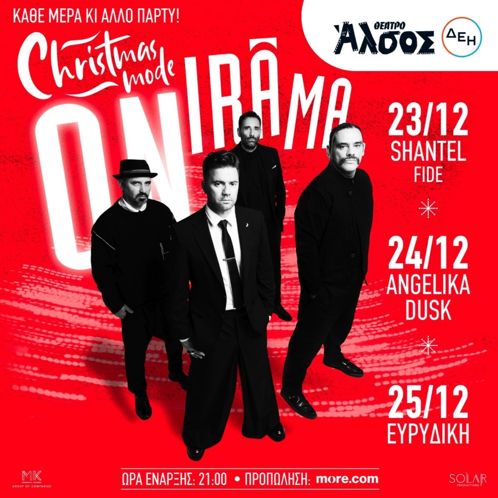 Ανήμερα τα Χριστούγεννα, η νύχτα είναι αφιερωμένη στη μαγεία των γιορτών! Η ατμόσφαιρα κορυφώνεται με την παρουσία της Ευρυδίκης, μιας από τις πιο ξεχωριστές και αγαπημένες ποπ-ροκ φωνές της ελληνικής μουσικής σκηνής. Μαζί με τους ONIRAMA υπόσχονται να μας χαρίσουν αξέχαστες στιγμές και να τραγουδήσουν μαζί τις μεγαλύτερες επιτυχίες, κάνοντας τα Χριστούγεννα ακόμα πιο φωτεινά.