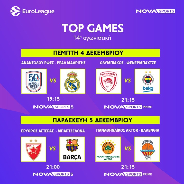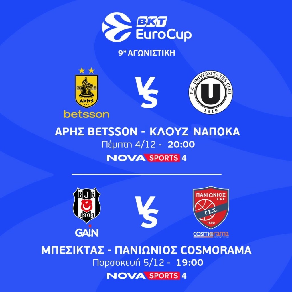 Στο EuroCup με τη διπλή ελληνική εκπροσώπηση, οι ομάδες επιστρέφουν στην αγωνιστική δράση με τη διεξαγωγή της 9ης αγωνιστικής και τις αναμετρήσεις Άρης Betsson-Κλουζ Ναπόκα (4/12, 20:00) και Μπεσίκτας-Πανιώνιος Cosmorama Travel (5/12, 19:00). Παράλληλα, την επόμενη εβδομάδα για την 10η αγωνιστική οι φίλοι του μπάσκετ θα απολαύσουν τους αγώνες Νάινερς Κέμνιτς-Πανιώνιος (9/12, 20:00, NovasportsPrime) & Άρης Betsson-Βενέτσια (10/12, 20:00 NovasportsPrime), καθώς και τις αναμετρήσεις Μπεσίκτας-Λιετκαμπέλις (9/12, 19:00, Novasports5), Μπουργκ-Τρέντο (9/12, 20:30, Novasports4), Χάποελ Ιερουσαλήμ-Αμβούργο (9/12, 21:00, NovasportsStart), Μπουντούτσνοστ-Λόντον Λάιονς (10/12, 20:00, Novasports4), Ουλμ-Άνκαρα (10/12, 20:00, NovasportsStart), Μανρέσα-Τσεντεβίτα Ολίμπια (10/12, 21:45, Novasports5).