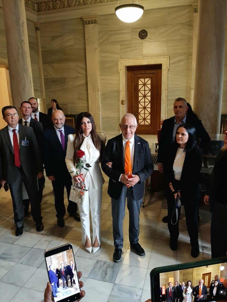 Με ένα κόκκινο τριαντάφυλλο υποδέχθηκε ο πρόεδρος της Βουλής, Νικήτας Κακλαμάνης, την πρέσβειρα των ΗΠΑ στην Ελλάδα, Κίμπερλι Γκιλφόιλ, που επισκέπτεται το κοινοβούλιο.