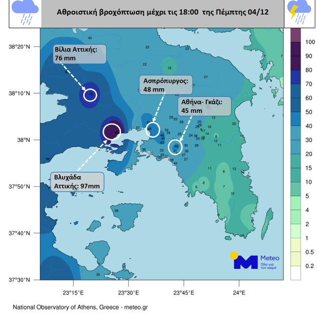 Σύμφωνα με τα δεδομένα που κατέγραψαν οι σταθμοί του δικτύου αυτόματων μετεωρολογικών σταθμών του Εθνικού Αστεροσκοπείου Αθηνών στη Βλυχάδα έπεσαν 97 χιλιοστά, ακολουθούν τα Βίλια με 76 χιλιοστά και ο Ασπρόπυργος με 48 χιλιοστά. Στο κέντρο της Αθήνας, στο Γκάζι η βροχή έφτασε τα 45 χιλιοστά.