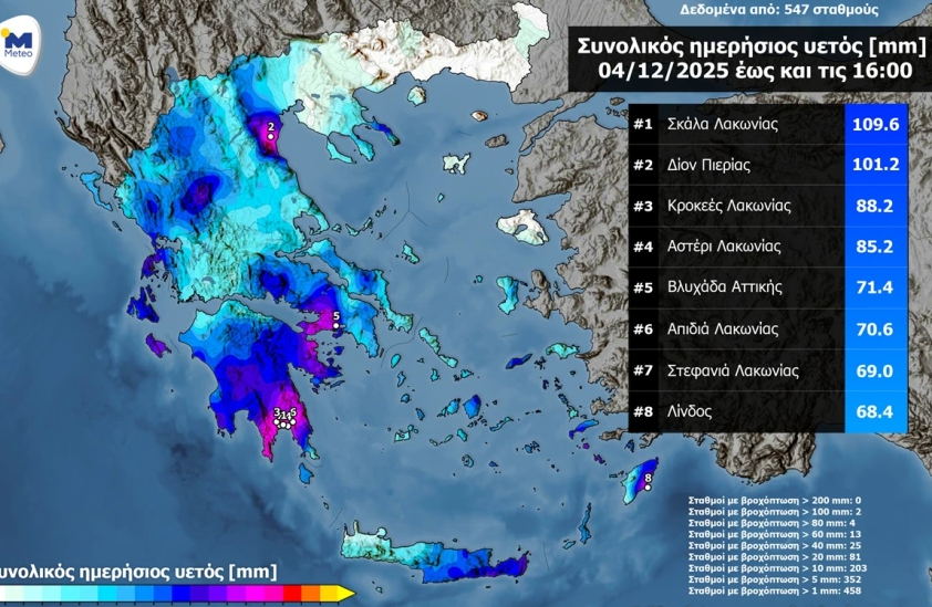 Η Σκάλα Λακωνίας δέχθηκε το μεγαλύτερο όγκο βροχής με 109 χιλιοστά, ακολουθεί το Δίον Πιερίας με 101,2 χιλιοστά και οι Κροκεές Λακωνίας με 88,2 χιλιοστά.