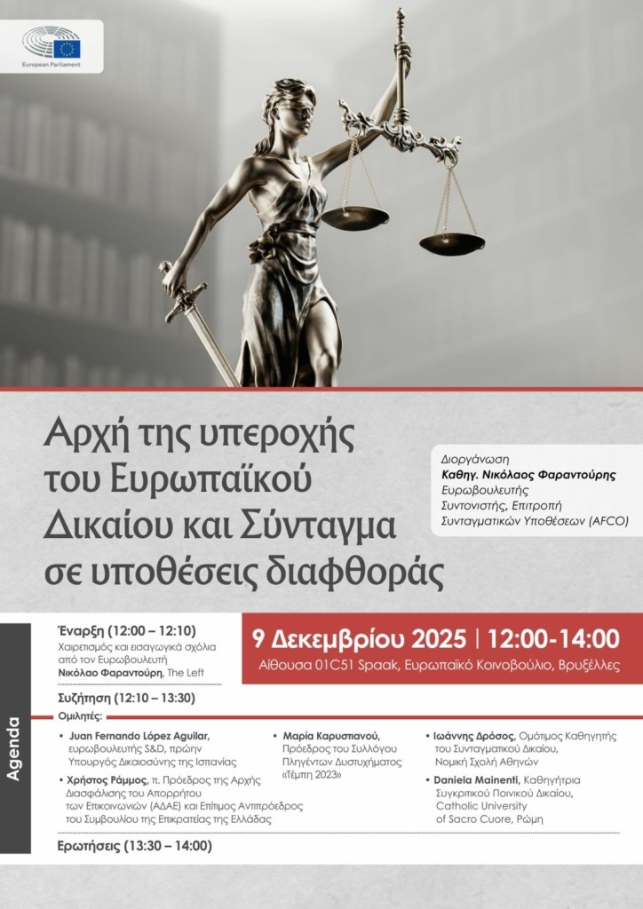Η εκδήλωση θα πραγματοποιηθεί την ερχόμενη Τρίτη 9 Δεκεμβρίου 2025 στις Βρυξέλλες και θα εστιαστεί στο ρόλο του Ευρωπαϊκού Δικαίου έναντι διατάξεων, όπως το άρθρο 86 του Συντάγματος, η επίκληση του οποίου εμποδίζει την έρευνα των Ευρωπαϊκών Αρχών και την εφαρμογή θεμελιωδών αρχών του δικαίου της ΕΕ σε υποθέσεις διαφθοράς.