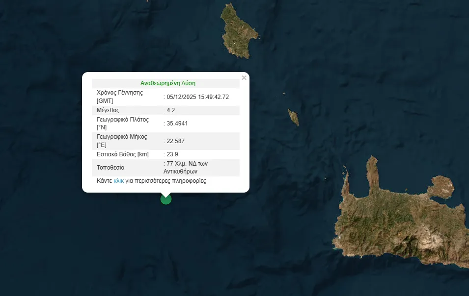 Σεισμός μεγέθους 4,2 βαθμών της κλίμακας Ρίχτερ σημειώθηκε στις 17:49 το απόγευμα της Παρασκευής, 5/12, ανοιχτά των Αντικυθήρων.