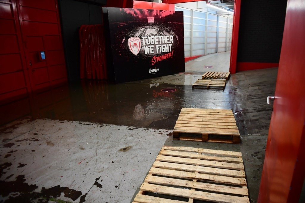 Ενώ η χώρα γινόταν πρώτο θέμα σε ολόκληρη την Ευρώπη, η ΚΑΕ Ολυμπιακός διαβεβαίωνε μέχρι την ύστατη στιγμή πως «το ΣΕΦ είναι απολύτως λειτουργικό», την ίδια ώρα που το στάδιο είχε μετατραπεί σε ένα μωσαϊκό από νάιλον, μουσαμάδες, σακούλες και παλέτες να συγκρατούν τα νερά που εισέβαλαν από την οροφή. Οι παίκτες μάλιστα βγήκαν στο παρκέ μετά την ανακοίνωση της αναβολής για να σουτάρουν, σε μια κίνηση που ερμηνεύθηκε ως προσπάθεια να αποδείξουν ότι το παρκέ ήταν playable και το πρόβλημα βρισκόταν αλλού.